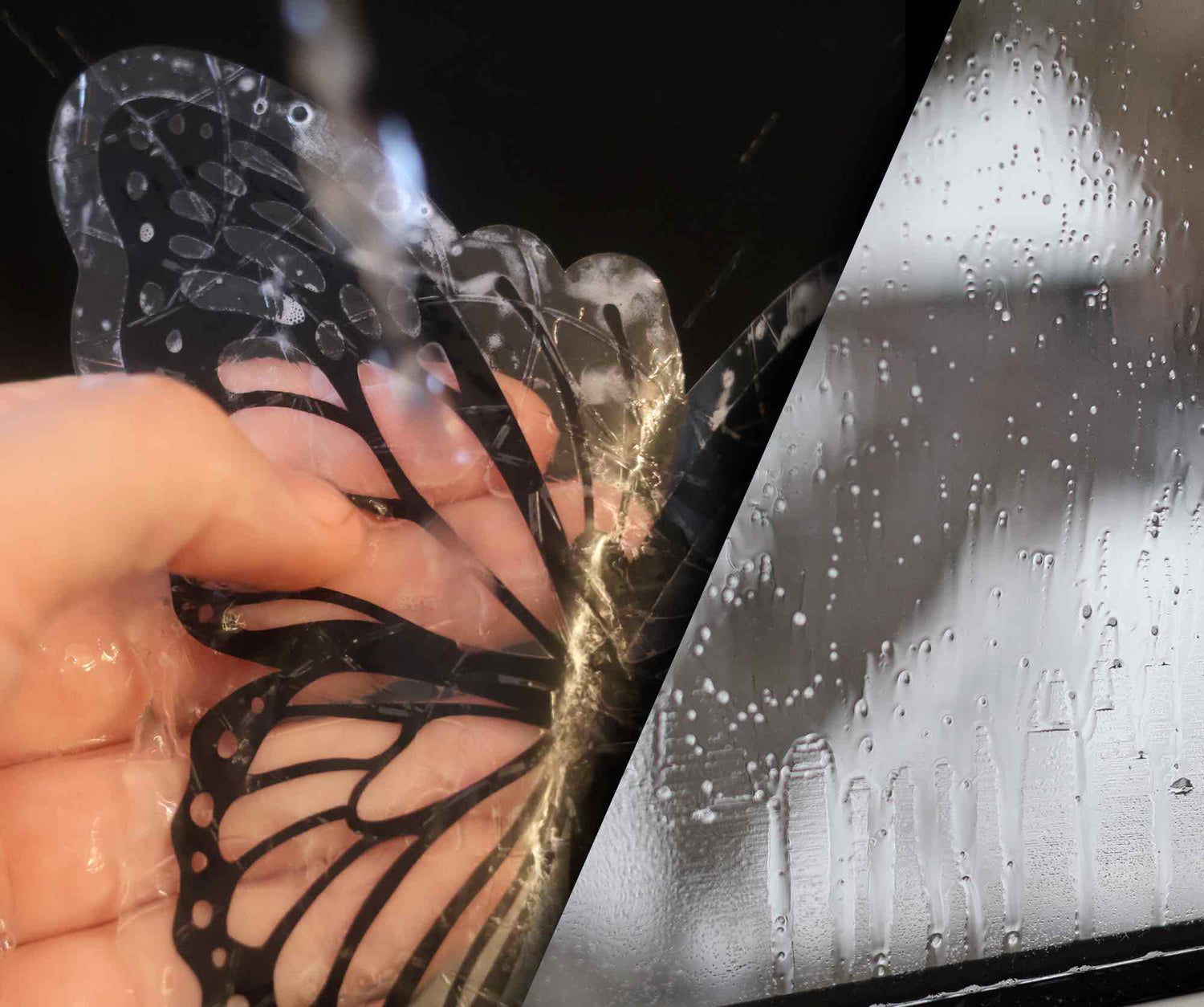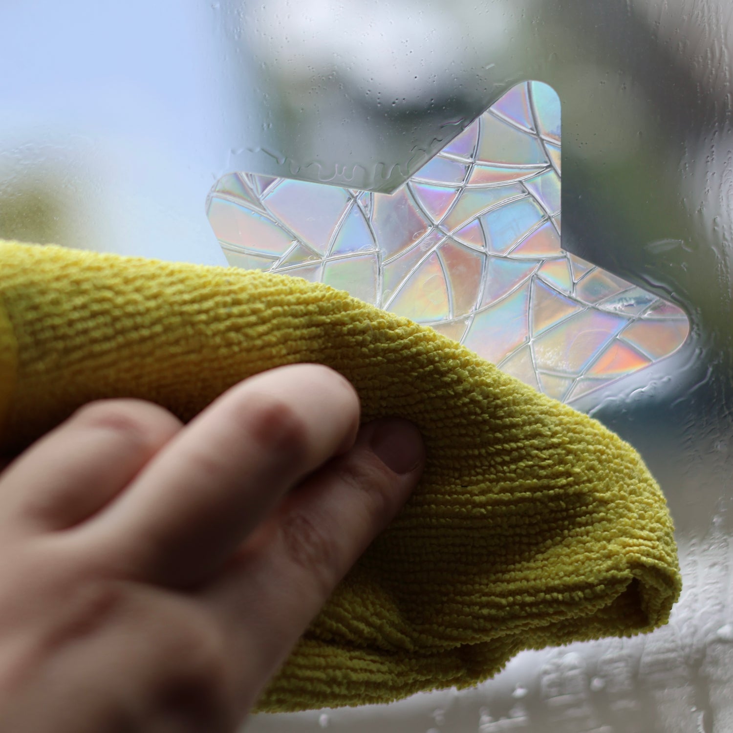 Drücke den Sticker dann an das Fenster und schiebe mit einem Microfasertuch vorsichtig das Wasser unter dem Sticker weg.