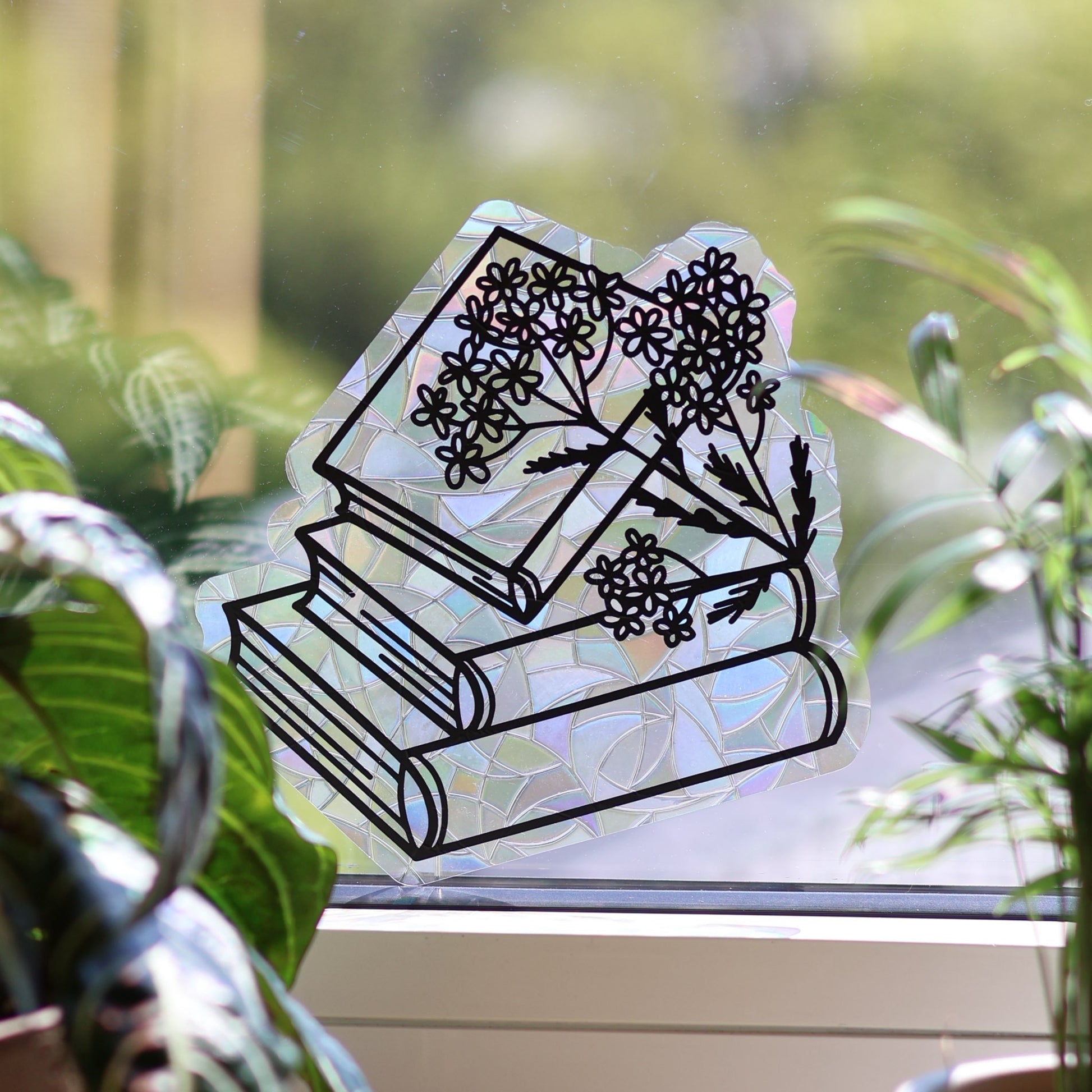 Der perfekte Sonnenfänger für jeden Bücherwurm. Verwandle deine Leseecke in ein Regenbogenparadies mit diesem süßen Sonnenfänger Sticker mit einem Bücherstapel mit Blumen als Motiv.
