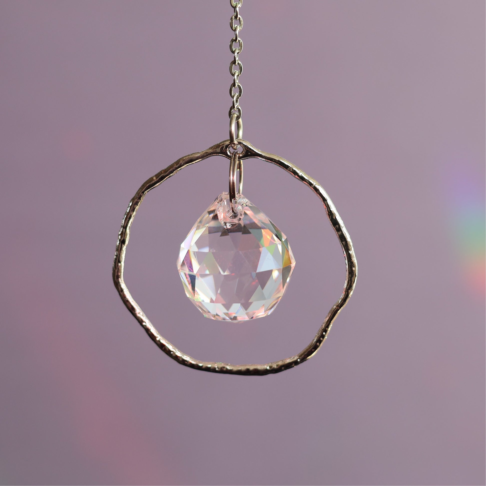 Der Prismakristall bildet das Herzstück, er bricht das Sonnenlicht in lebendige Regenbögenpunkte, die durch den ganzen Raum tanzen.