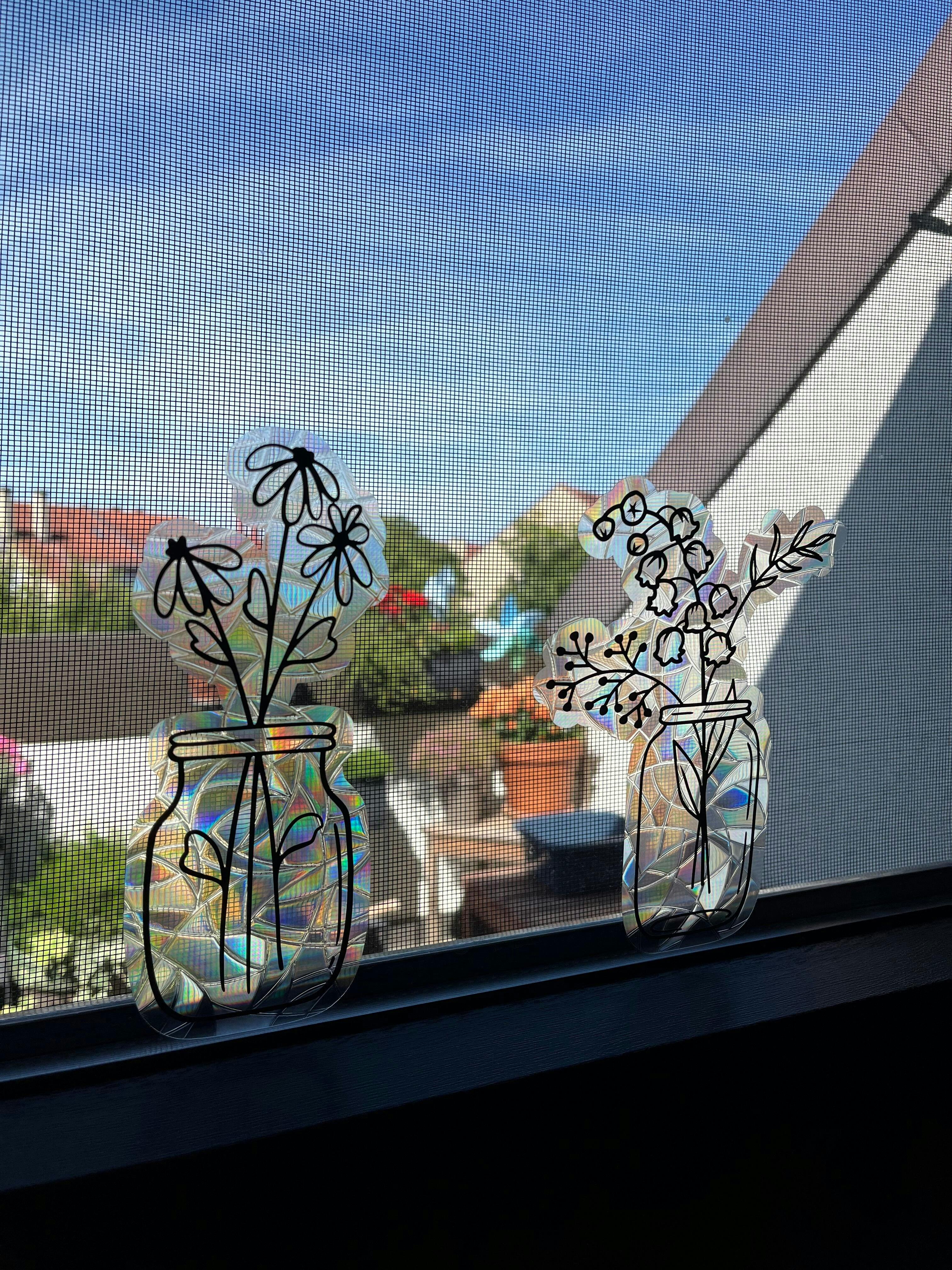 Der perfekte Sonnenfänger für jeden Pflanzenmenschen. Nutze auch den letzten Platz in deinem Zuhause für Blumen mit diesem süßen Sonnenfänger Sticker mit einem Blumenstrauß aus Maiglöckchen in einer Vase als Motiv.