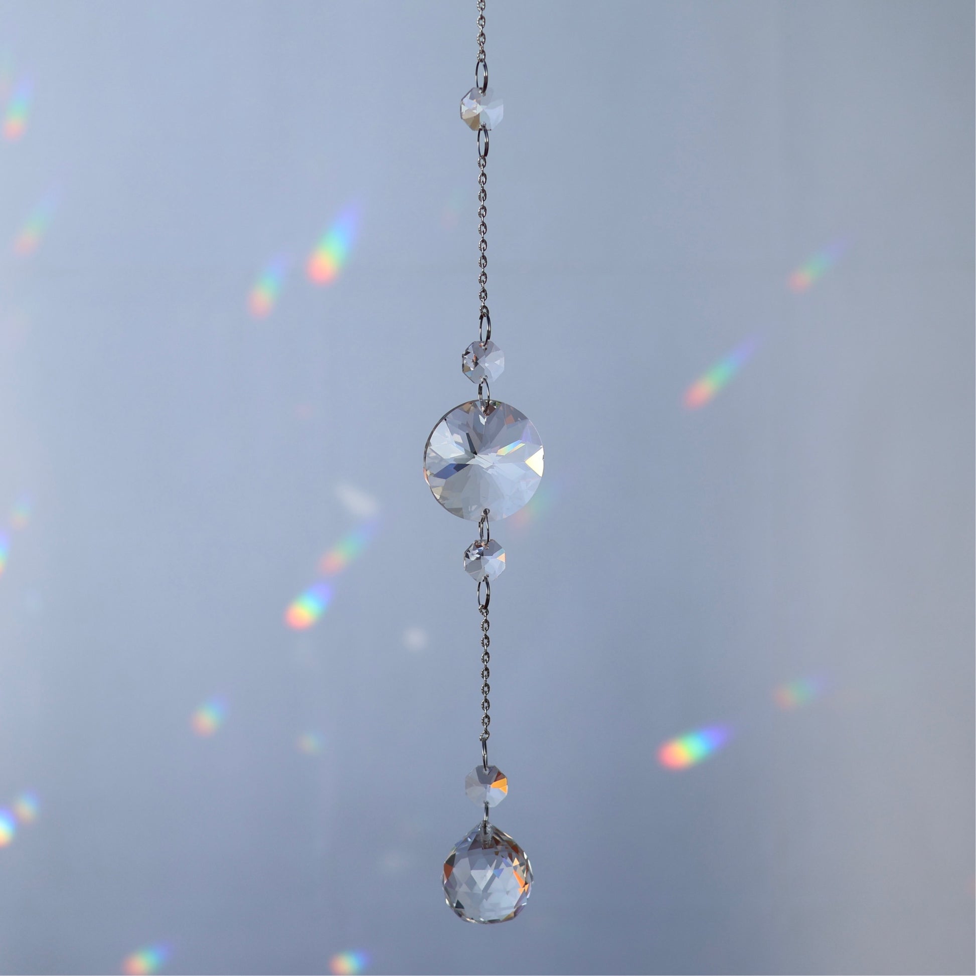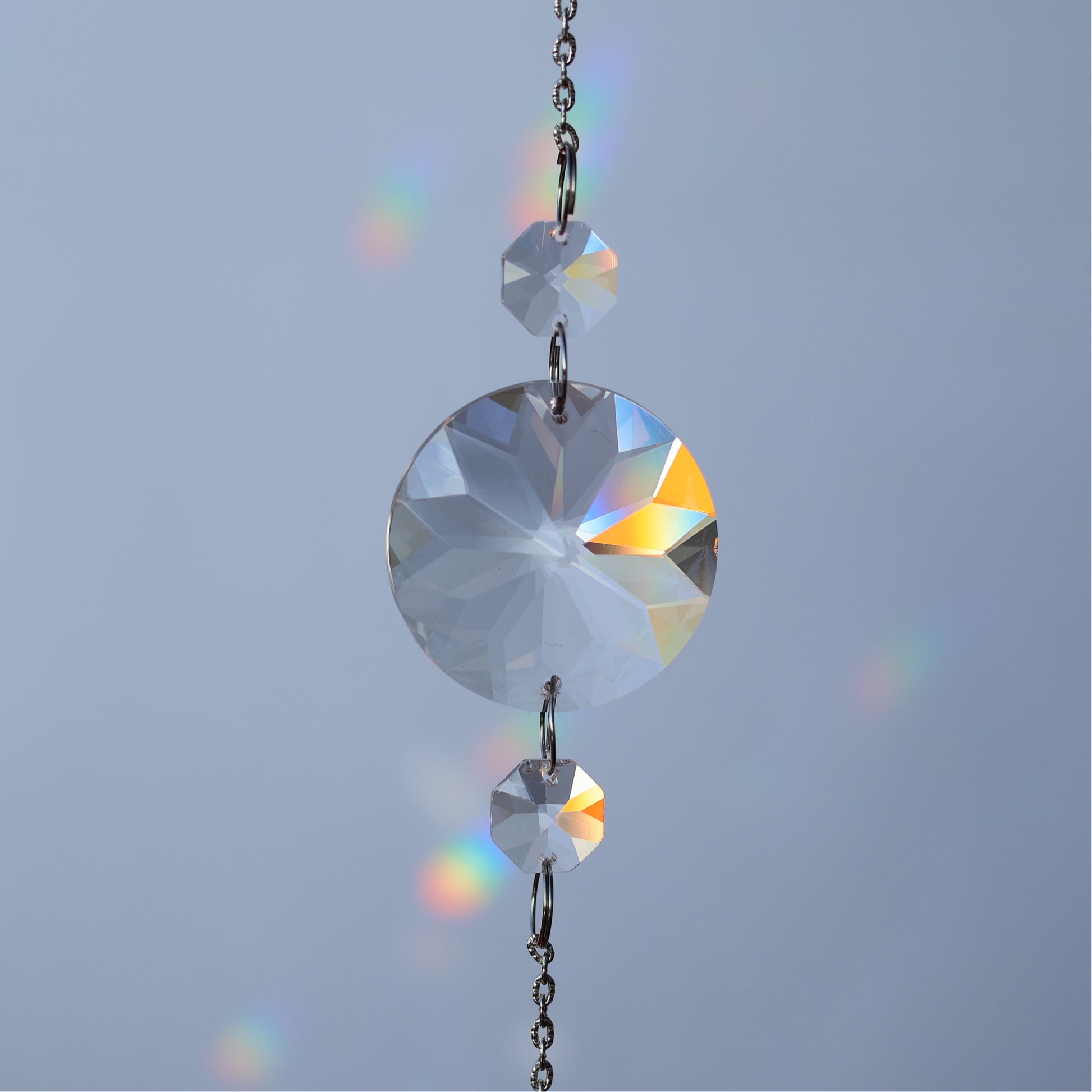 Die Prismakristalle bildet das Herzstück, sie brechen das Sonnenlicht in lebendige Regenbögenpunkte, die durch den ganzen Raum tanzen.