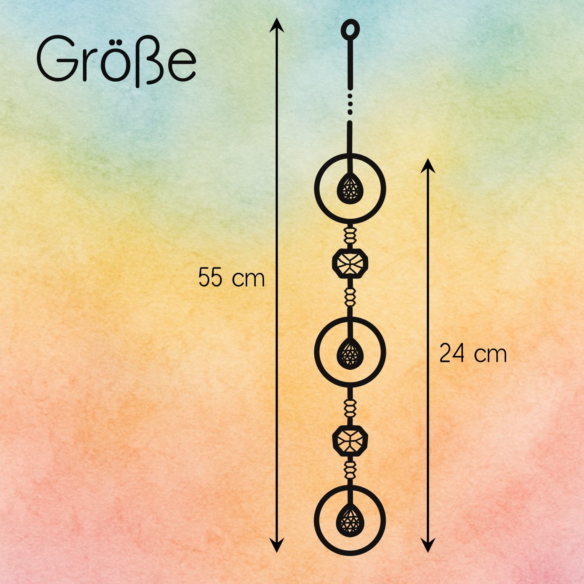 Das dekorative Element misst ca. 24 cm, die gesamte Länge inklusive Aufhängung liegt bei etwa 55 cm.
