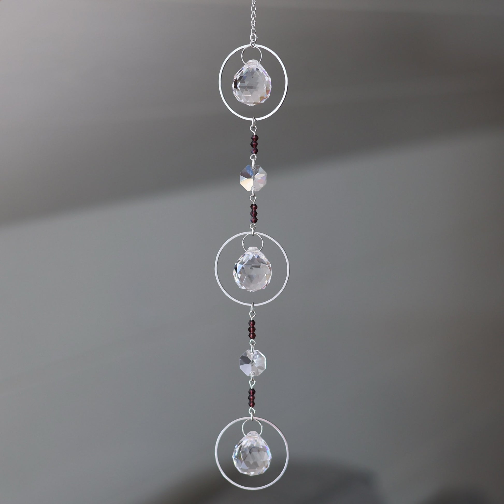 Die Prismakristalle bildet das Herzstück, sie brechen das Sonnenlicht in lebendige Regenbögenpunkte, die durch den ganzen Raum tanzen.