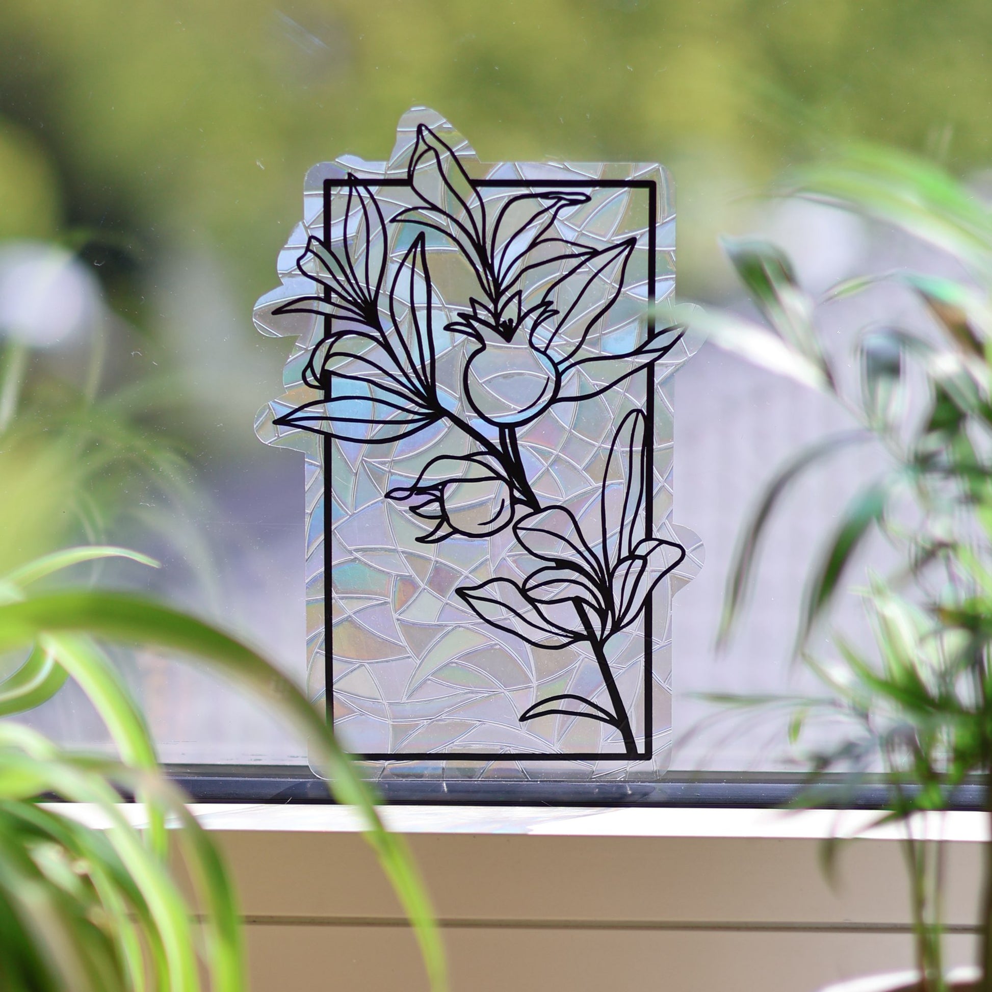 Der perfekte Sonnenfänger für jeden Pflanzenmenschen. Nutze auch den letzten Platz in deinem Zuhause für Blumen mit diesem Sonnenfänger Sticker mit einem Obstzweig mit Rahmen als Motiv.