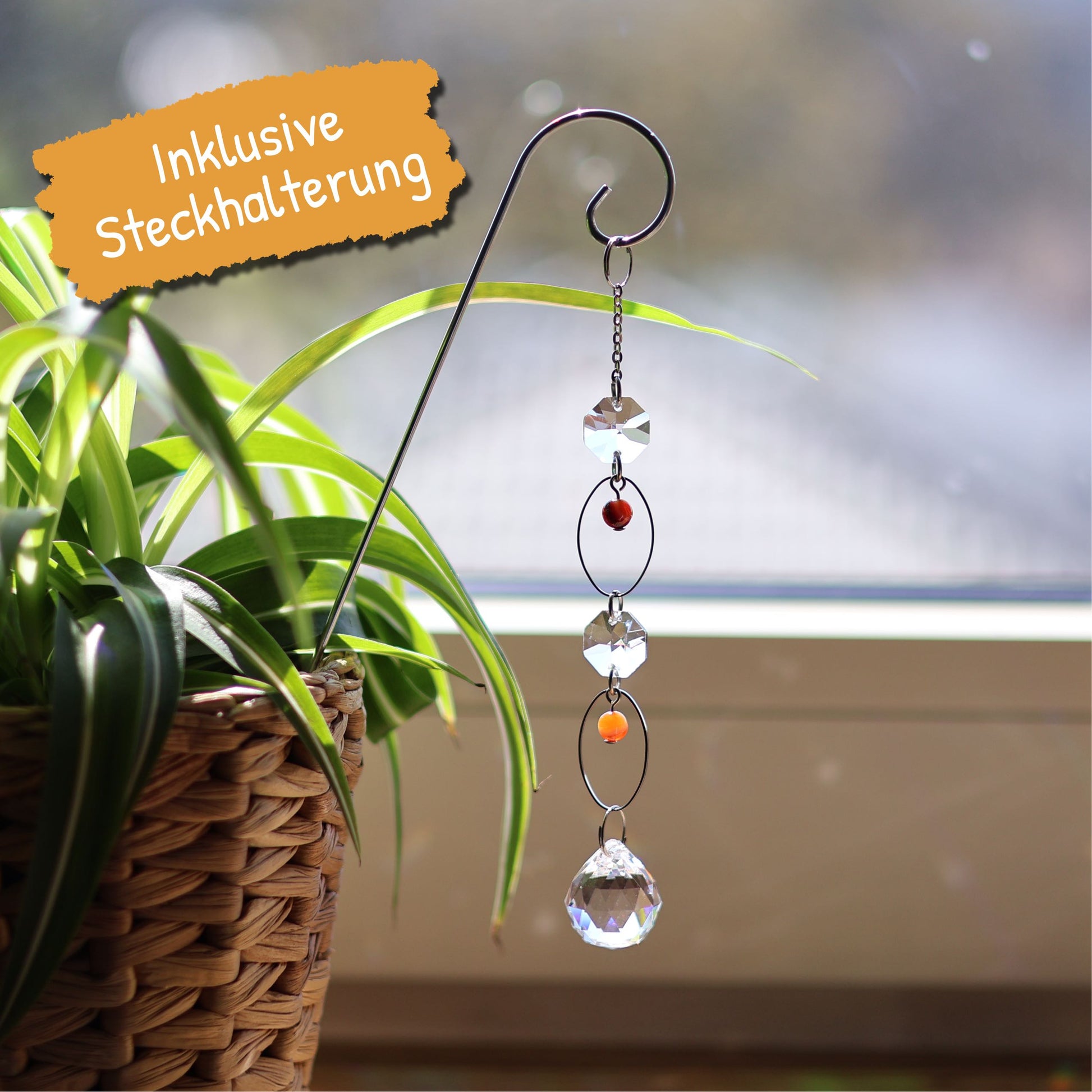 Bei jedem Sonnenstecker ist ein Pflanzenstecker aus Metall im Lieferumfang dabei, mit dem du den kleinen hängenden Sonnenfänger an deinem Pflanztopf befestigen kannst.