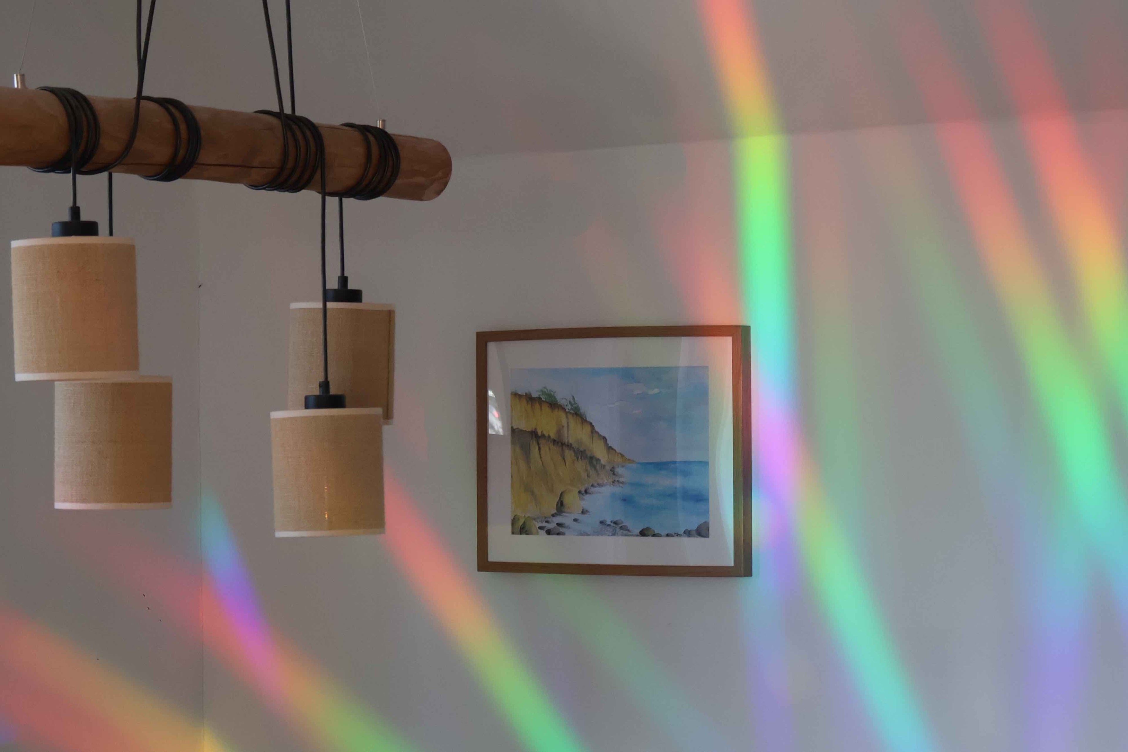Der Sonnenfänger funktioniert wie ein Prisma, bei Sonneneinstrahlung wird das Licht gebrochen und als Regenbogen sichtbar.